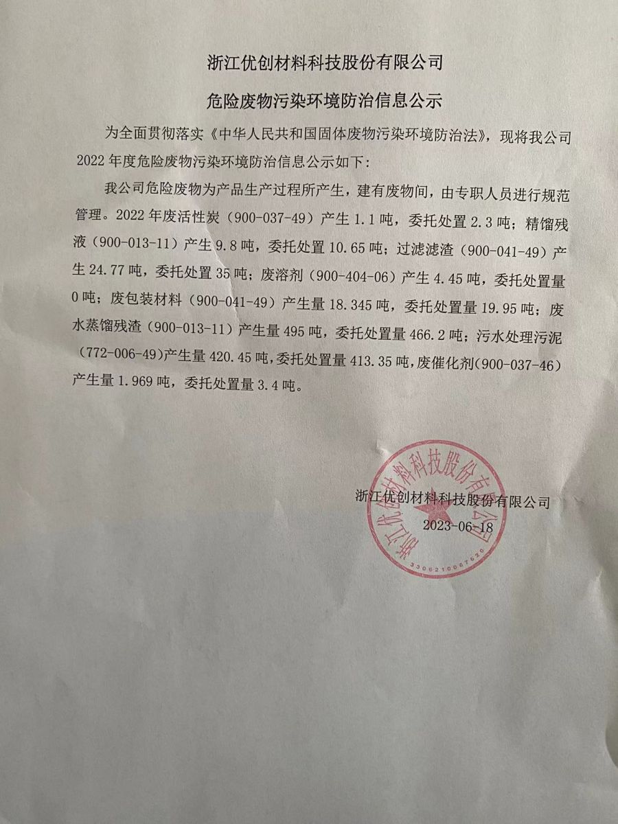 浙江優(yōu)創(chuàng)材料科技股份有限公司 危險(xiǎn)廢物污染環(huán)境防治信息公示